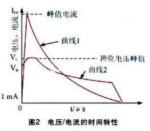 圖2 是在雙蹤示波器上觀(guān)察到的TVS 管在承受大電流沖擊時(shí)的電流及電壓波形。圖中,曲線(xiàn)1 是TVS 管中的電流波形,可以看出:其流過(guò)TVS 管的電流由1mA 突然上升到峰值后,然后按指數(shù)規(guī)律下降。曲線(xiàn)2 是TVS 管兩端的電壓波形,它表示TVS 中的電流突然上升時(shí),TVS 兩端電壓也隨之上升。在浪涌電壓的作用下,TVS 兩極間的電壓由額定反向關(guān)斷電壓VRWM 上升到擊穿電壓VB 而被擊穿。隨著擊穿電流的出現(xiàn),流過(guò)TVS 的電流將達(dá)到峰值脈沖電流IPP,同時(shí)其兩端的電壓被箝位到預(yù)定的最大箝位電壓VC 以下。其后,隨著脈沖電流按指數(shù)衰減,該過(guò)程中,TVS 兩極間的電壓也不斷下降,最后恢復(fù)到初態(tài),這就是TVS 抑制可能出現(xiàn)的浪涌脈沖功率,保護(hù)電子元器件的過(guò)程。事實(shí)上,當(dāng)TVS 兩極受到反向高能量沖擊時(shí),它能以10-12s 級(jí)的速度,將其兩極間的阻抗由高變低,以吸收高達(dá)數(shù)千瓦的浪涌功率,使兩極間的電位箝位于預(yù)定值,從而有效地保護(hù)電子設(shè)備中的元器件免受