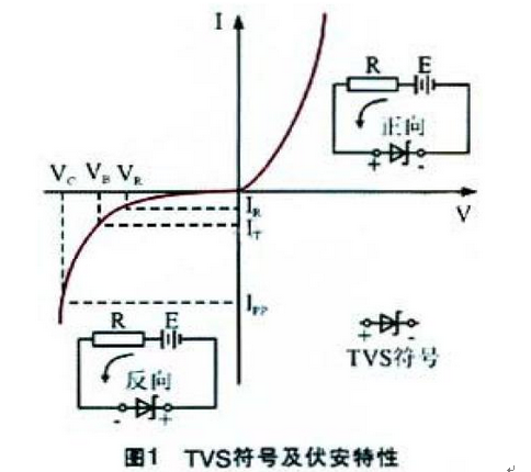 TVS是普遍使用的一種新型高效電路保護(hù)器件,它具有極快的響應(yīng)時(shí)間(亞納秒級(jí))和相當(dāng)高的浪涌吸收能力。當(dāng)它的兩端經(jīng)受瞬間的高能量沖擊時(shí),TVS能以極高的速度把兩端間的阻抗值由高阻抗變?yōu)榈妥杩?,以吸收一個(gè)瞬間大電流,從而把它的兩端電壓箝制在一個(gè)預(yù)定的數(shù)值上,從而保護(hù)后面的電路元件不受瞬態(tài)高壓尖峰脈沖的沖擊。正因?yàn)槿绱?,TVS 可用于保護(hù)設(shè)備或電路免受靜電、電感性負(fù)載切換時(shí)產(chǎn)生的瞬變電壓[4],以及感應(yīng)雷所產(chǎn)生的過(guò)電壓。圖1所示為T(mén)VS 的符號(hào)及伏安特性曲線(xiàn)。